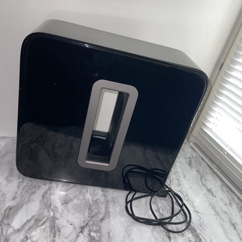 Sonos Sub subwoofer i svart utförande. Trådlös aktiv baslåda avsedd att användas tillsammans med kompatibla Sonos-högtalare och hemmabiosystem för att förstärka lågfrekvent ljud. Enheten är konstruerad för placering stående eller liggande på golv och ansluts till eluttag med medföljande strömkabel. Passar för användning i vardagsrum, tv-rum eller andra utrymmen där extra bas önskas i ljudsystemet.