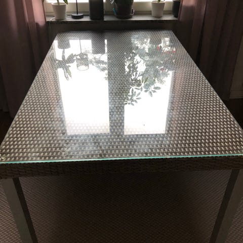 Matgrupp bestående av ett rektangulärt matbord med glasbordsskiva och 6 st stolar.