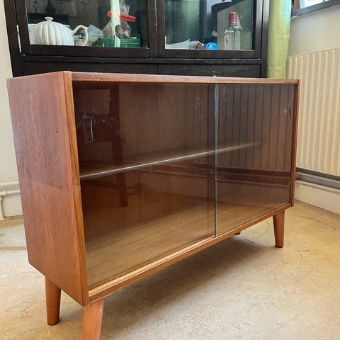 Säljer ett stilrent retro sideboard/byrå i mycket fint skick. Möbeln har två praktiska lådor upptill samt två rymliga hyllor med hyllplan undertill – perfekt för både förvaring och exponering.