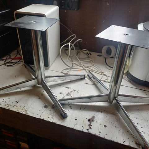 Högtalarstativ i metall i silverfärg. Märke Linn Katan Stand. Stativen består av två pelare med rektangulära bottenplattor och triangle/trekantiga toppplattor med toppiggar för bättre ljud/mindre vibrationer. Passar bäst för triangle/trekantiga högtalare. Passar som stabilt underlag för mindre till medelstora högtalare i hemmet eller studion. Höjd 65 cms