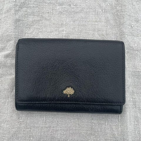 Mulberry plånbok i svart läder med klassiskt Mulberry- emblem på framsidan. Utsidan är tillverkad i präglat läder. Plånboken har dragkedja på sidan för myntfack samt flera fack invändigt som kan rymma kort, sedlar och kvitton. Passar som vardagsplånbok eller för förvaring av kort och kontanter i handväska. Mått: 14x9,5 cm