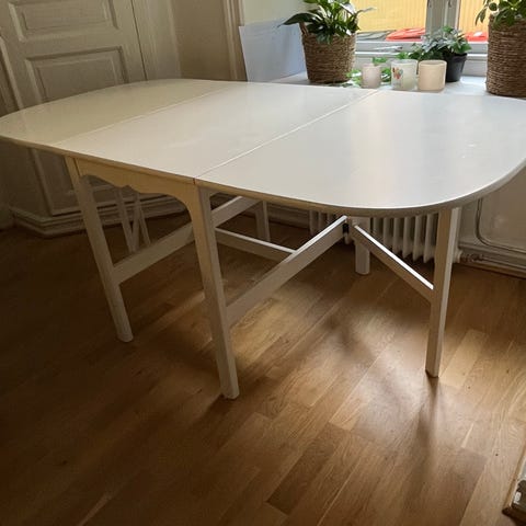 Fint bord i ljust trä, rundade ben. Ett år gammalt säljes pga flytt. Iläggskiva se mått för mer detaljer