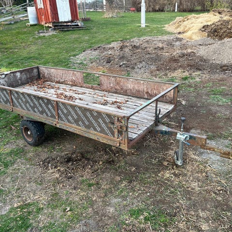 Dragkärra från 50- talet med trälåda och metallram. Fullt fungerande. Koppling för åkgräsklippare finns. Finns dessutom fyra väggar som kan monteras på.