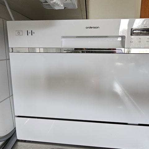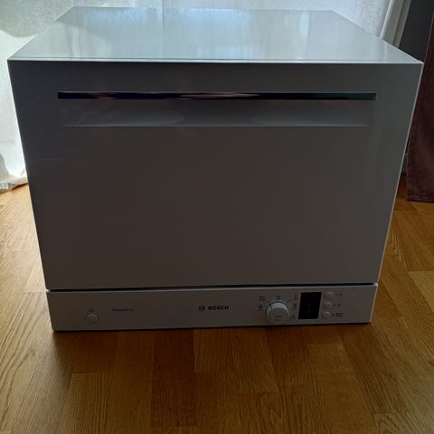 Bosch bänkdiskmaskin i vit färg. Fristående modell som placeras på bänk. Frontpanel med vred och knappar för programval. Passar för mindre kök, exempelvis i lägenhet, studentboende eller fritidshus. Standard anslutningsslangar och elkabel medföljer enligt bild. En del åverkan på utsidan som visar på användning men det påverkar inte funktionen!