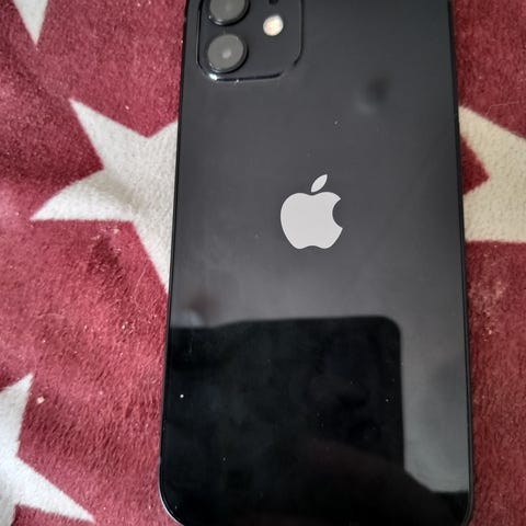 Apple iPhone 12 smartphone med 64 GB intern lagring. Modellen på bilderna visar en svart enhet. Skärmen har synliga sprickor och slitage. Operativsystemet är iOS och batterihälsan visas på skärmbilden.
