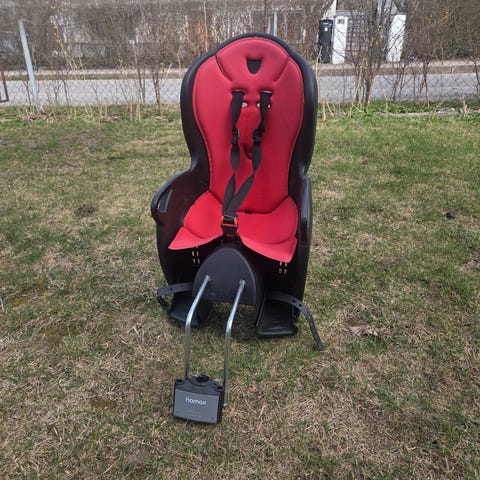 Hamax cykelsits för barn i storlek 22. Sitsen har röd insida och svart ytterdel. Utrustad med justerbart bälte och fotstöd med remmar. Monteras bakom sadeln på cykel med medföljande fäste. Avsedd för transport av barn på cykel enligt tillverkarens rekommendationer.