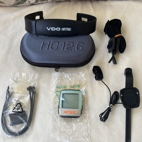 Bontrager Trip 300 cykeldator i vit färg. Modellen visar hastighet, distans och tid på en digital display. Cykeldatorn är avsedd för montering på cykelstyre och passar för registrering av tränings- och pendlingsturer. På bilderna syns även Bontrager-cykelskor och en Bontrager Pro Pack S-sadelväska, vilket ingår i samma utrustningspaket.