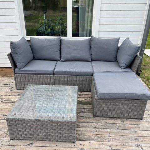 Divansoffa i konstrotting med beige kuddar för balkong/altan. Inköpt från K-rauta juni 2024, kvitto finns. Sparsamt använd. Mycket fint skick!