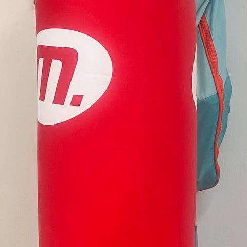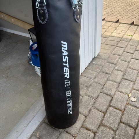 Exigo boxsäck i svart och röd färg med kedjeupphängning i metall för montering i tak. Säckens yttre material är slitstarkt och anpassat för box- och kampsportsträning.