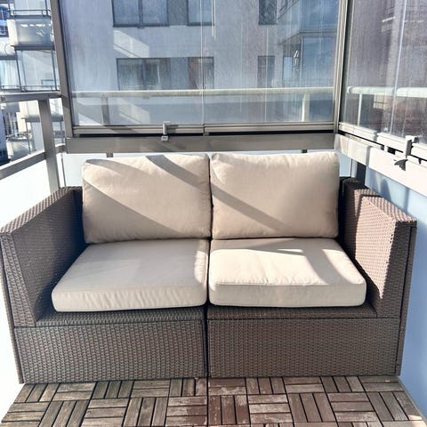 Säljer min utomhussoffa som passar perfekt på balkongen. Säljes pga flytt till hus. Lite små rostfläckar men inget man tänker på. Inköpt 2021 från Ellos så den håller bra för väder och vind!