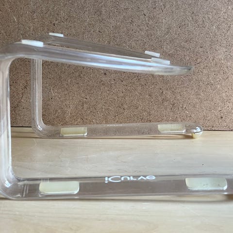 Stället är avsett för att hålla en bärbar dator stående vertikalt på skrivbord eller annan plan yta. Passar för att spara plats och organisera arbetsytan samt ge stabil förvaring av datorn när den inte används.
