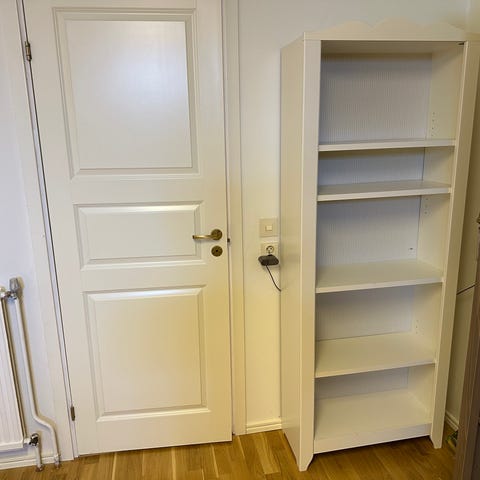 Hylla och vitrinskåp IKEA. Båda 197x90x34 cm. Hyllplanen är instabila men kan lösas med längre hyllplanshållare.