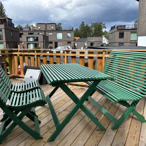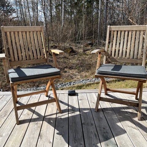 Trädgårdsmöbelset i teak bestående av två stolar och ett litet bord. Stolarna är fällbara och har ribbad sits och ryggstöd.