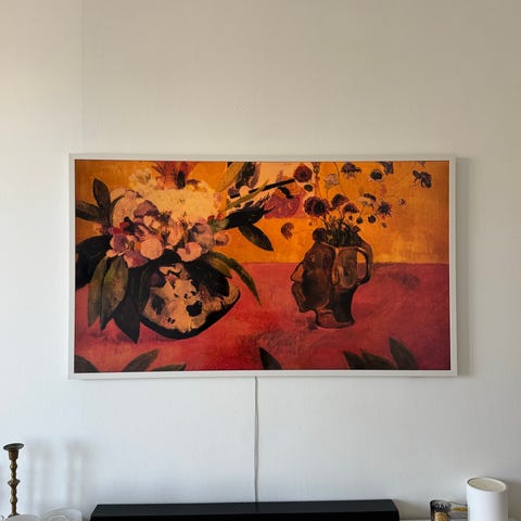 Tvn är en Samsung 43” The Frame, LS03A 4K QLED med vit ram köpt 2021.
