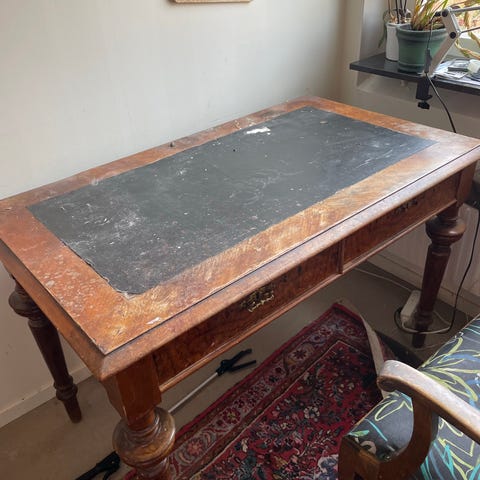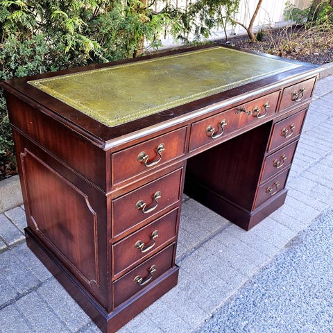 Klassiskt engelskt skrivbord med skinnunderlag och stol som ingår.