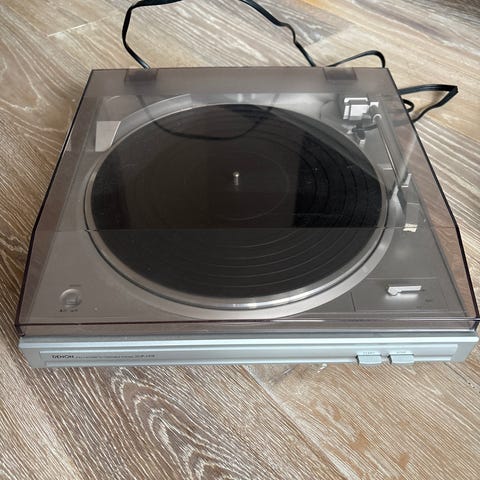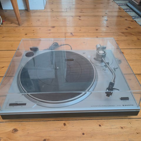 Begagnad remdriven JVC skivspelare. Den är helautomatisk, innebär att med hjälp av ett knapptryck så läggar sig tonarmen automatiskt på skivan. När skivan är slut så åker tonarmen automatiskt till sitt grundläge och stannar. Den känner också av om du lagt på en LP eller EP skiva, tonarmen kommer landa på rätt ställe automatiskt. Finns adapter för EP skivor.