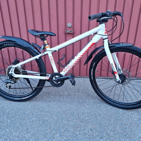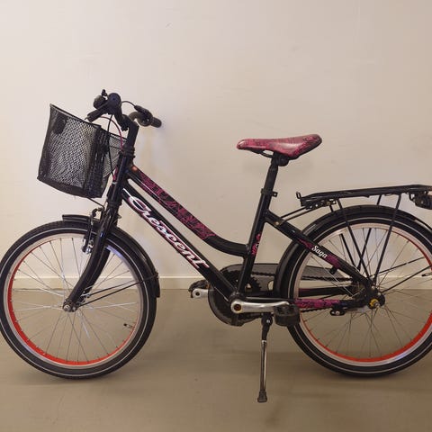 Crescent stadscykel för tjej med ramstorlek XS och 24" hjul. Cykeln har svart ram med rosa detaljer, lågt insteg och upprätt sittställning anpassad för vardagscykling. Utrustad med pakethållare bak, stöd och reflexer. Passar för barn som behöver en mindre stadscykel för cykling i vardagen.