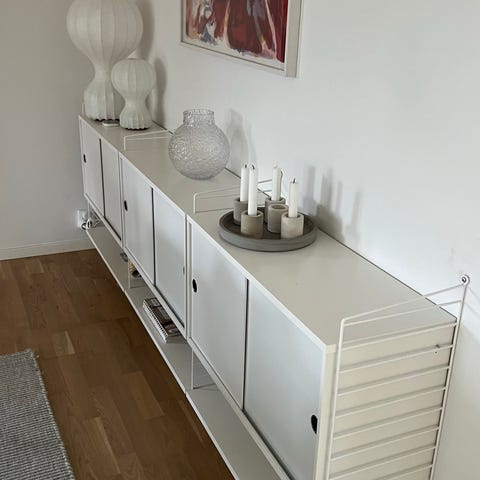 String hyllsystem formgivet av Nils Strinning. Väggmonterat system i vit metall med gavlar, hyllplan och två skåp med skjutdörrar. Skåpen har invändiga hyllplan för dold förvaring och öppna hyllor ovanför ger plats för böcker, dekoration eller förvaring. Passar till exempel i vardagsrum, arbetsrum eller hall.