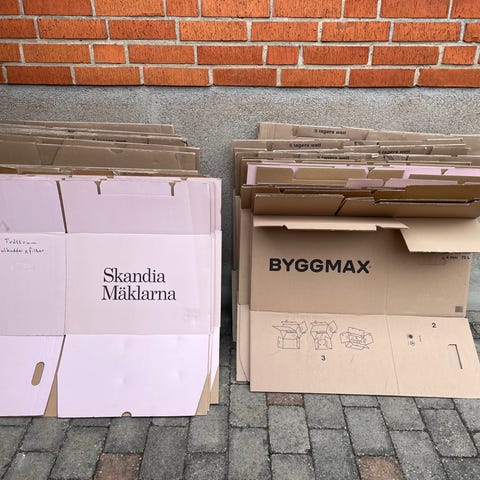 Säljer 25 stycken flyttlådor. Merparten från Rusta, Flyttkartong Pro.