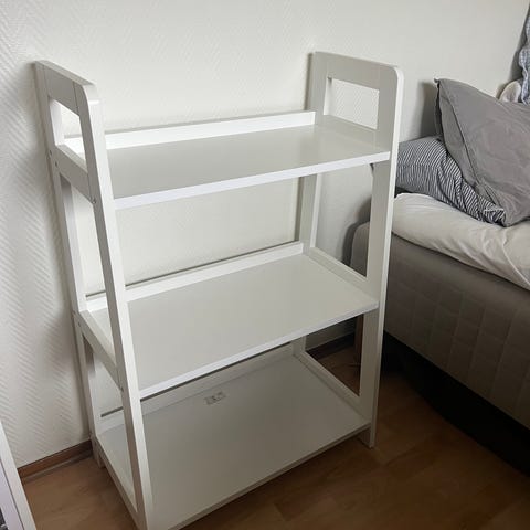 Jysk hylla med tre hyllplan i vit färg. Öppen stomme med sidor som har utskurna handtag/öppningar upptill. Passar till förvaring i till exempel badrum, hall, kök eller sovrum. Materialet är målat trä/träfiberskiva enligt produktbilderna. Fristående modell som kan placeras mot vägg eller fritt i rummet.
