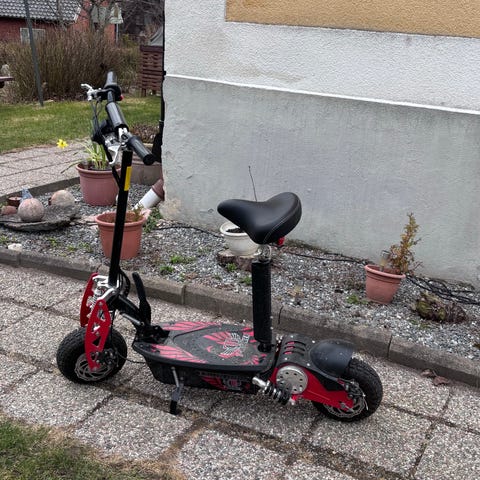 Elsparkcykel med sadel i svart färg. Modellen har ståplatta med mönstrad dekor, styre med handbroms och gasreglage samt kedjedrift bak. Utrustad med luftfyllda däck fram och bak samt hopfällbart stöd. Passar för kortare transporter eller fritidskörning på jämnt underlag. Märke och exakt modell är inte angivna.