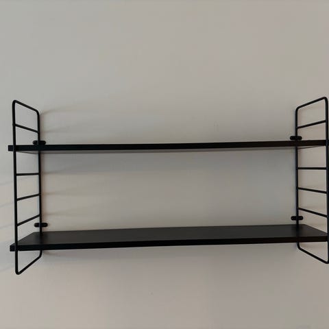 Svart vägghylla med två flyttbara hyllplan. 60x78cm, djup 19cm.