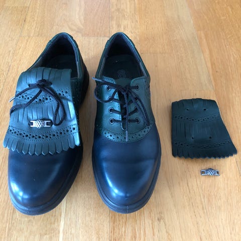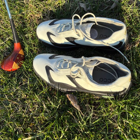 Ett par Adidas golfskor som är cirka 25 år gamla. De är endast använda en dag - tills min fru bestämde sig för att utöva en annan sport.
