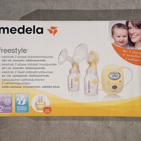 Medela Freestyle Hands-free elektrisk dubbelbröstpump. Bröstpumpen är utformad för att möjliggöra pumpning utan att behöva hålla i trattarna med händerna. Den har en kompakt, uppladdningsbar pumpenhet med USB-anslutning och två uppsamlingskoppar som placeras i behån. Produkten är avsedd för ammande personer som vill kunna pumpa ur bröstmjölk från båda brösten samtidigt. Setet inkluderar pumpenhet, slangar och uppsamlingskoppar enligt vad som visas på bilderna.