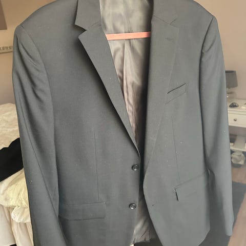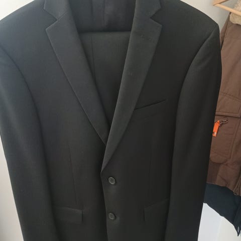 Dressmann kostym för herr i svart färg. Kostymen består av kavaj och byxa. Storlek S på överdelen. Material enligt uppgift bomull. Klassisk modell med två knappar på kavajen och flera fickor. Byxan har storlek 29-32 enligt etikett på insidan. Passar för vardag, arbete eller mer formella tillfällen där en enkel svart kostym önskas.