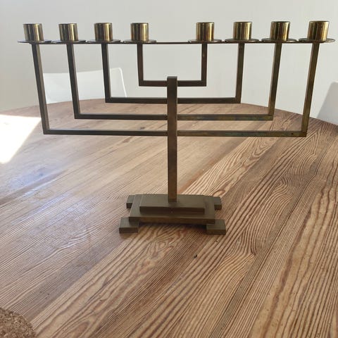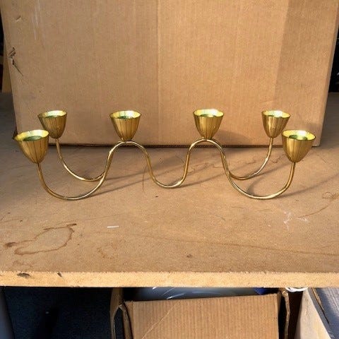 Den här ljusstaken har tillverkats av min mormors bror Sven. Den är söt men jag använder den inte så den står bara i ett skåp. Den ser ut att vara tillverkad i mässing och den behöver putsas. Det finns också lite stearinrester kvar i hållarna men annars är den i bra skick. Höjd: 20,2 cm. Bredd: 19,7 cm.