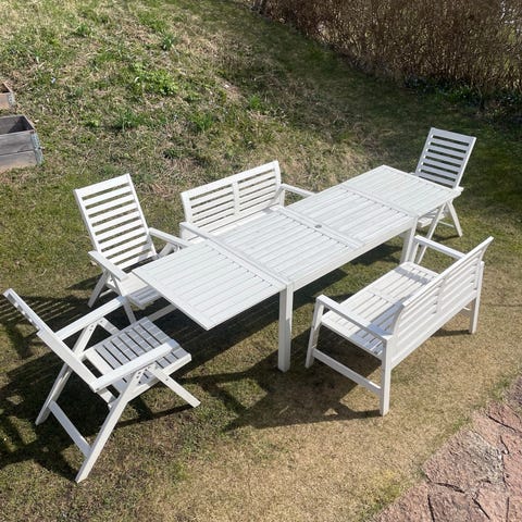 Tre moduler från Ikeas Äpplarö: två med varsitt ryggstöd och en utan. Stadiga och fina men skulle må bra av att oljas in. Två svarta dynor + kuddar medföljer om så viljes.
