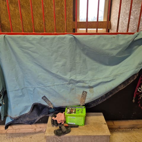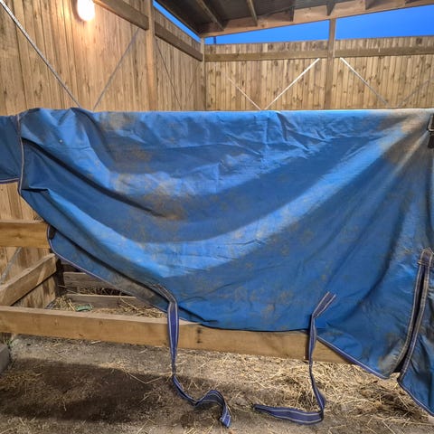 Vega hästtäcke i storlek 145 cm. Täcket är blått med ljusa kanter och remmar. Yttermaterial i tyg med quiltat innerfoder. Utrustat med bogknäppning och bukgjordar. Passar som stall- eller utetäcke beroende på behov och väderförhållanden.
