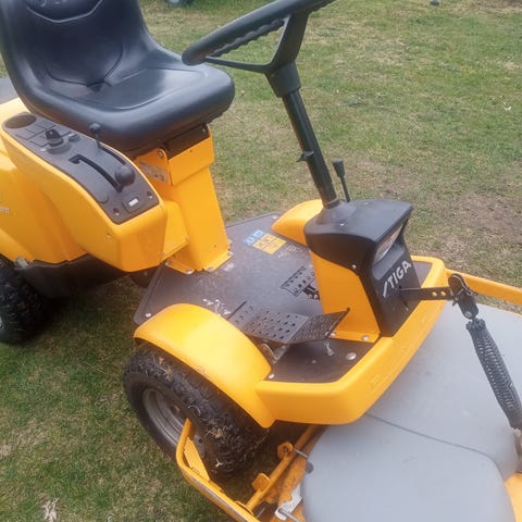 Stiga Park åkgräsklippare i gul och svart färg. Modellen har frontmonterat klippaggregat och förarsäte med ryggstöd. Maskinen styrs med ratt och är avsedd för sittande förare vid klippning av gräsmatta på större ytor. Passar för användning i trädgårdar, runt byggnader och på andra grönytor där åkgräsklippare behövs.