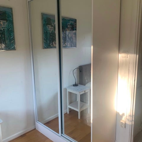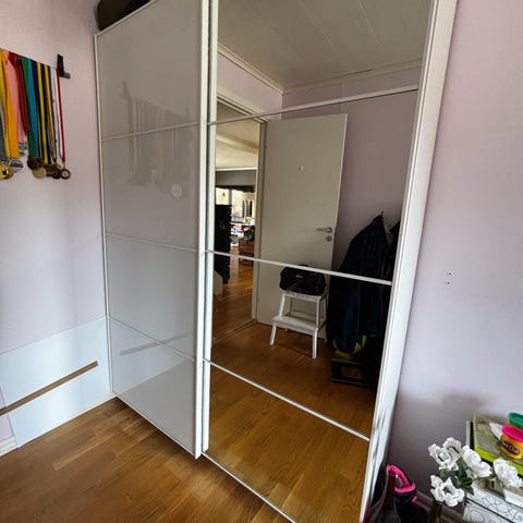 Garderob med skjutdörrar och en spegeldörr. I mycket gott skick. Hämtas i närheten av Vreta, Norrtälje. Obs att den är tung och måste bäras nedför en liten backe. Vi kan tyvärr inte erbjuda bärhjälp.