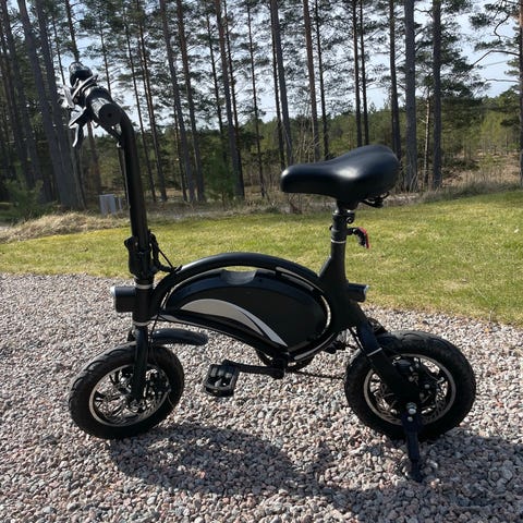Freev elcykel i kompakt utförande. Cykeln har mindre hjul, svart ram och sadel samt integrerad batterienhet i ramen. Utrustad med framlykta, handbroms och styrreglage med på/av-knapp. Passar för kortare pendlingssträckor och stadskörning där en liten och lättmanövrerad elcykel behövs. Bakbroms fungerar, frambroms fungerar ej (beläggen behöver troligtvis bytas) både lamporna bak och fram fungerar,. Däcken är i fint skick, laddare ingår.