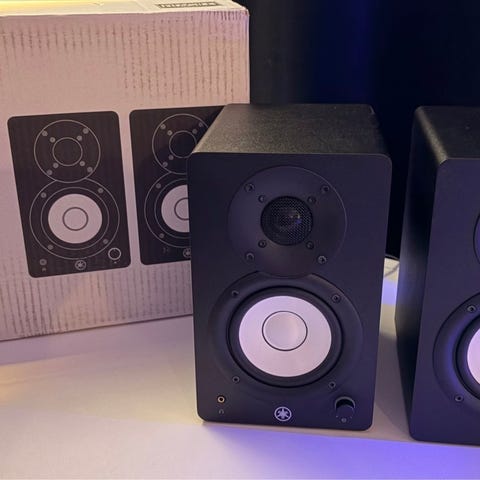 Yamaha aktiva högtalare i svart utförande. Modellen är ett par kompakta studiomonitorer med inbyggd förstärkare i varje högtalare. På baksidan finns anslutningar för ljudingång samt reglage för nivå och justering av ljudet. Passar för användning vid musikproduktion, datorljud eller som kompakta högtalare i mindre rum. Högtalarna är utformade för placering på bord, stativ eller hylla.