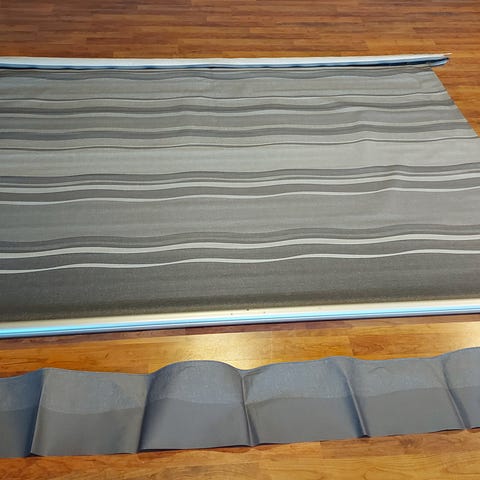 Markisen och sidoväggarna är grå och vita och i gott skick (inga fläckar finns). Förmodligen använd ett fåtal gånger av tidigare ägare. Påsen till markisen har ett litet hål i vardera ände under dragkedjan , dragkedjan är helt okey.