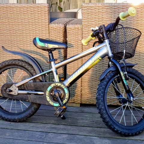 Crescent barncykel med 16" hjul i blå och orange färg. Cykeln har ram med låg instegshöjd, fotbroms bak och handbroms fram. Utrustad med sadel i ljus färg och styrstång/barnvagnshandtag baktill för att kunna hjälpa barnet vid cykling. Passar barn som ska lära sig cykla eller som första större cykel efter balanscykel.