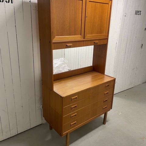 Nätt men rymlig teakhylla med skjutdörrar. Stadig, hel och felfri med smärre slitage.