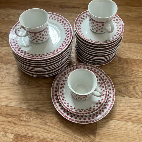 En söt kaffeservis från Bavaria med motiv av Svenska landskapsblommor. 10 stycken koppar och fat samt 2 extra koppar.