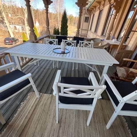 Hillerstorp Solvik sittgrupp med fina marinblå dynor. Möbeln är använd 2 säsonger och har vinterförvarats inomhus.