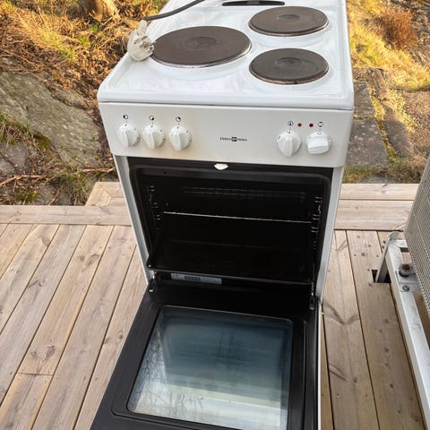 Spisen har tre elektriska plattor upptill och en ugn med glasfönster i ugnsluckan. Reglagen sitter på frontens högra sida. Ugnen är utrustad med ugnsgaller.