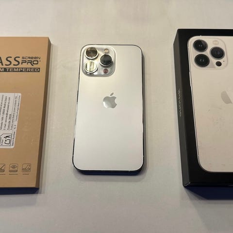 Apple iPhone 13 Pro smartphone med 256 GB intern lagring. Modellen har trippelkamera på baksidan, pekskärm på framsidan och Lightning-anslutning. Färg: vit. Lämplig för appar, surf, foto och video med gott om lagringsutrymme för filer och media.