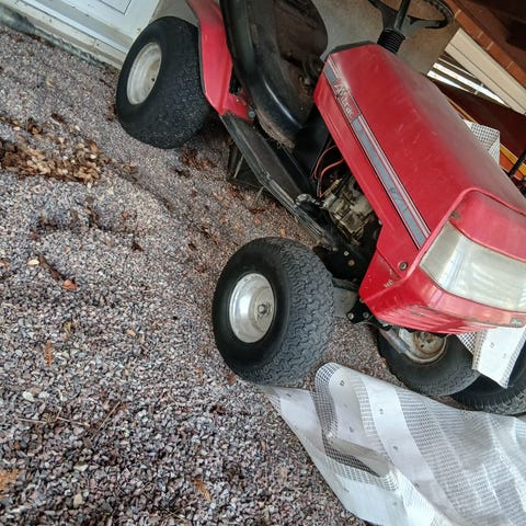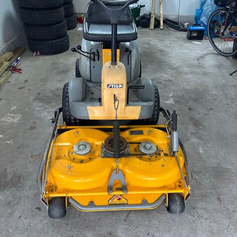 Åkgräsklippare som följde med huset. Startar inte men går förhoppningsvis att fixa för den som kan sånt. Jag kan ingenting om åkgräsklippare och kan således inte svara på några frågor, så detta är för dig som tycker det är spännande att köpa grisen i säcken.