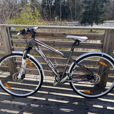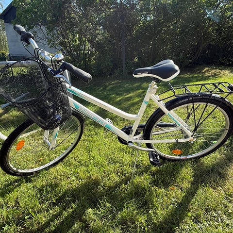 Crescent hybridcykel för kvinna med ramstorlek XS och 28" hjul (700c). Cykeln har rak styre och är utrustad med växlar bak. På bilderna syns pakethållare och monterad barnsits bak. Passar för pendling och vardagscykling på blandat underlag. Färg och exakt modellbeteckning framgår inte tydligt av underlaget.