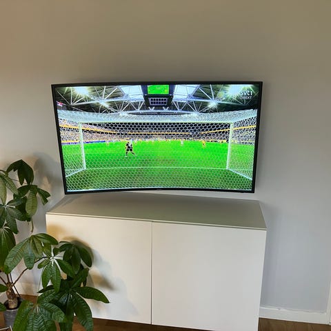 49 tums Smart-TV, 4K, på fot med välvd LCD-skärm.