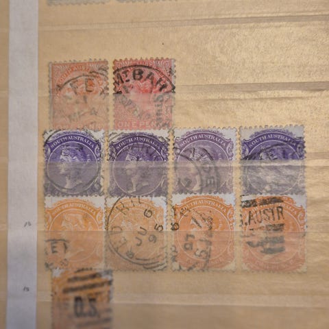 Frimärkssamling med frimärken från Australien i olika valörer och färger. Blandade motiv, huvudsakligen stämplade frimärken monterade i albumblad. Samlingen omfattar flera serier och utgåvor med både porträtt- och djurmotiv. Lämplig för samlare som vill komplettera eller påbörja en samling av australiska frimärken.