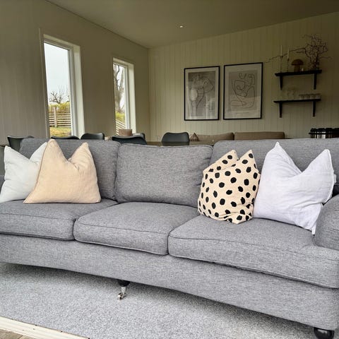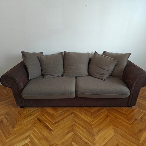 Soffan är ca 20 år gammal och välanvänd. Tyget är grågrönt, finns även ett tyg som är äggskal (vitt typ) men bara till soffan inte till pallen.