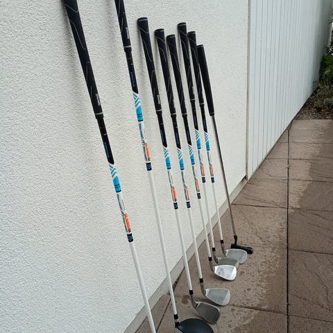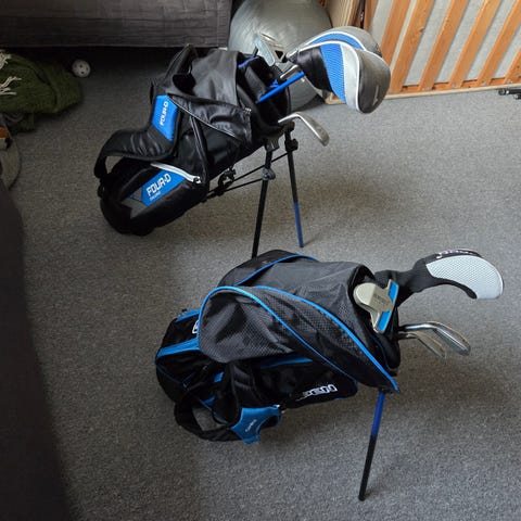 Setet innehåller flera järnklubbor samt headcovers. Bagen är en ståbag med utfällbara ben, bärrem och flera fack för förvaring av bollar, handskar och annat tillbehör (följer med en handske, några bollar och peggar). Passar för små golfspelare som vill ha ett startset med bag för träning och spel på bana. (Nypris ca 2000 kr)