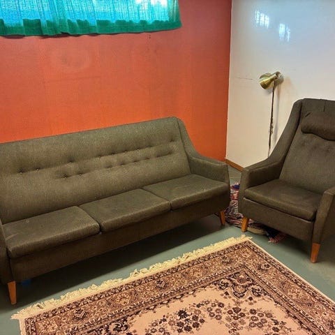 Gammal soffa med fåtölj
